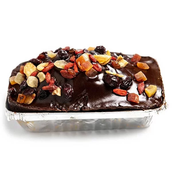 Checul invelit in ciocolata cu fructe confiate ChefSuperFood este un desert artizanal, pregatit manual, cu ingrediente naturale premium. Blatul pufos cu cacao si fulgi de ovaz se imbina cu bucati de fructe confiate, iar glazura bogata de ciocolata neagra belgiana si untul belgian ii ofera un gust intens si rafinat.