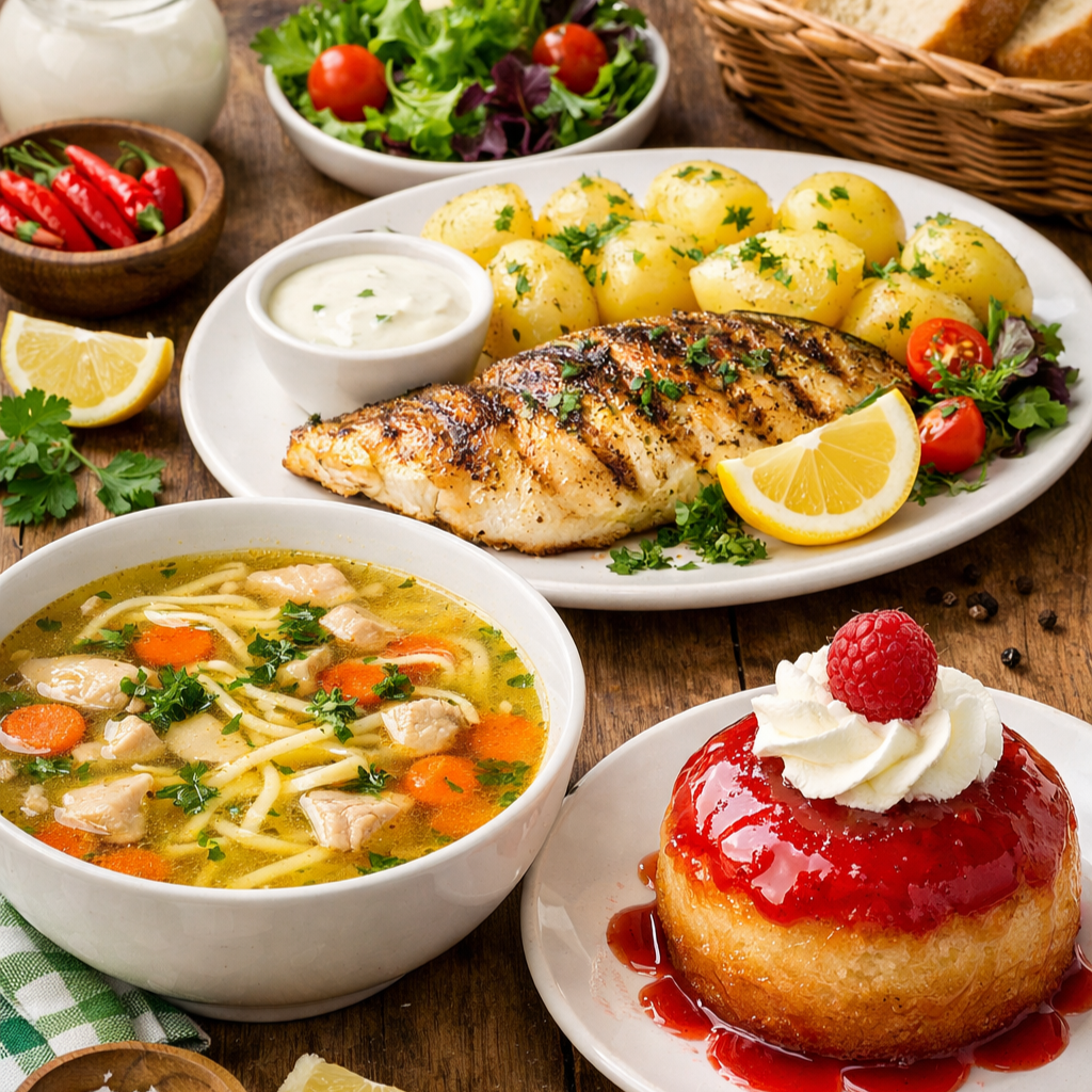 Meniul Complet ChefSuperFood este creat pentru mesele in familie, atunci cand iti doresti preparate simple, gustoase si bine echilibrate. Combinatia de supa traditionala, peste la plita si desert ofera o masa completa, potrivita pentru toti membrii familiei.