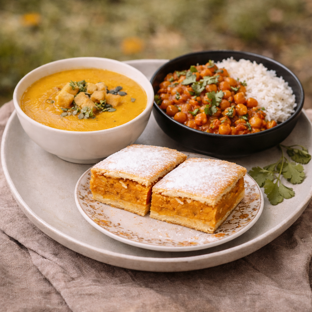 Meniu Complet de Post pentru Familie este o alegere echilibrata si satioasa, gatita artizanal, ideala pentru mesele de post petrecute in familie. Meniul include supa crema de legume, chana masala si desert, oferind o masa completa, gustoasa si hranitoare.
