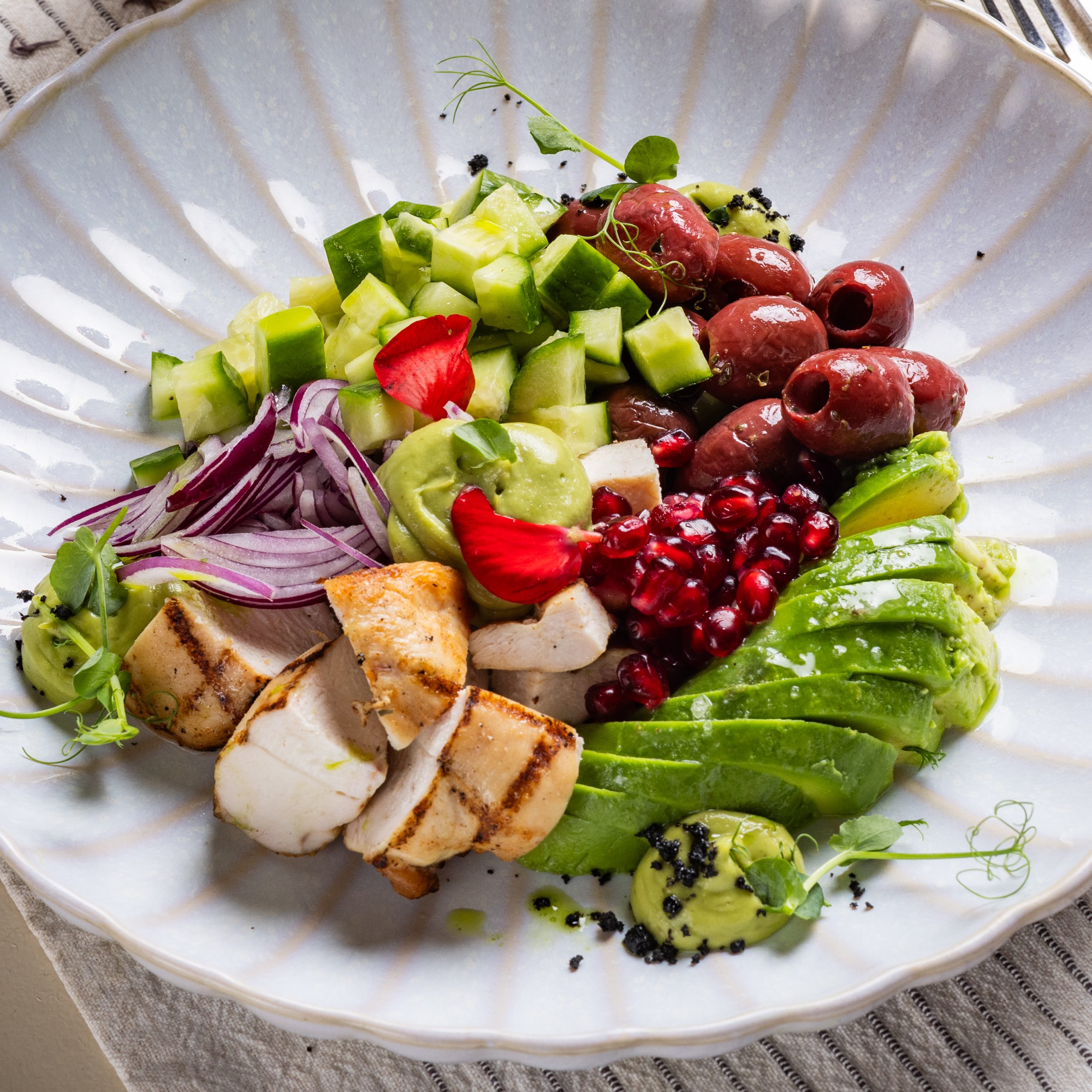 Avocado-ul cremos, rodia fresh si maslinele Kalamata ofera un contrast placut de gusturi, iar spuma de avocado adauga o textura fina si moderna. Livrare rapida in Bucuresti si Ilfov.